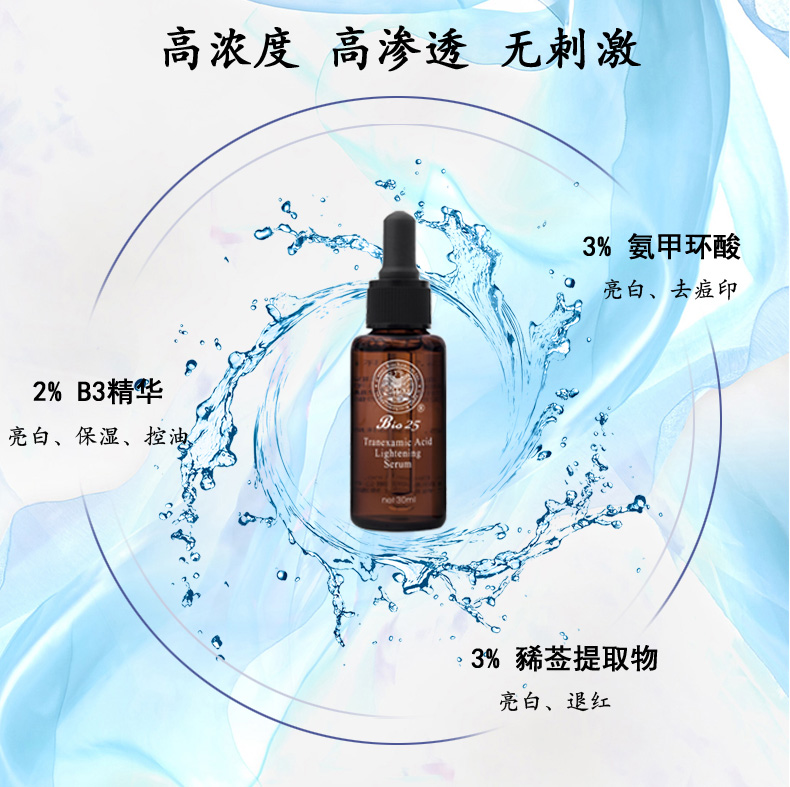 【主要功效成分】:3%氨甲环酸、2%烟酰胺、3%豨莶草提取物